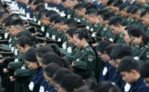Thousands of people clad in dark attire gathered at the public square of the Memorial Hall of the Victims in Nanjing Massacre by Japanese Invaders in Nanjing, with white flowers pinned to their chests, for the ceremony. China’s national flag was flown at half-mast in front of the crowd, which included survivors of the massacre, local students and international friends.